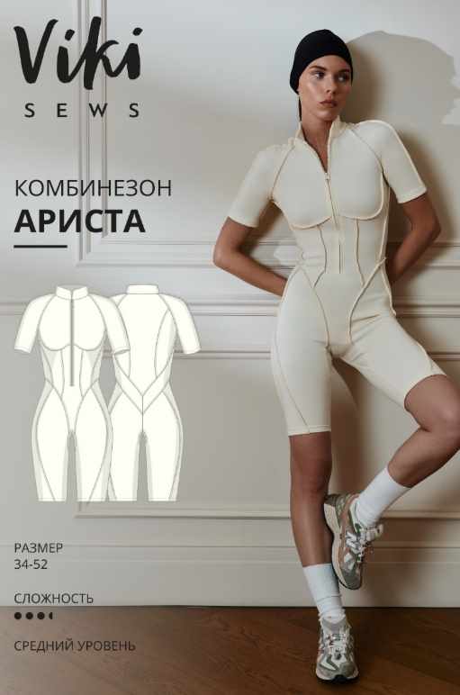 Выкройка комбинезона малого объема. На деталях переда и спинки фигурные рельефы, формирующие прилегающий силуэт. Воротник-стойка. На центральной части переда выполнена молния с рамками. Рукав реглан, выше локтя. Длина изделия выше колен.